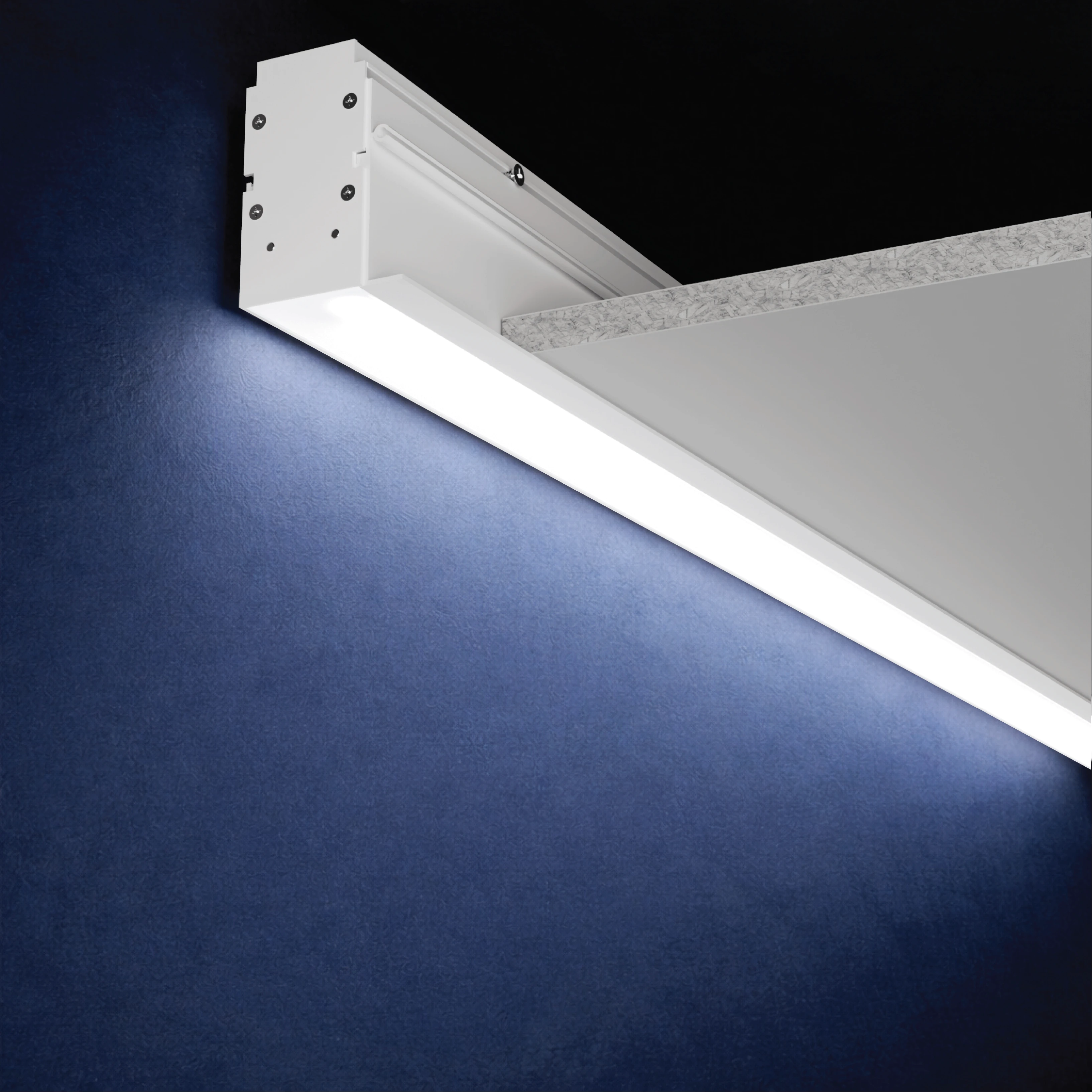 1 ¹³⁄₁₆” wide linear lighting system for perimeter lighting, recessed in grid or hard ceiling for direct illumination. Runs and patterns can be built to field dimensions. Up to 3" lens regress with continuous illumination in custom length runs and patterns with illuminated corners.