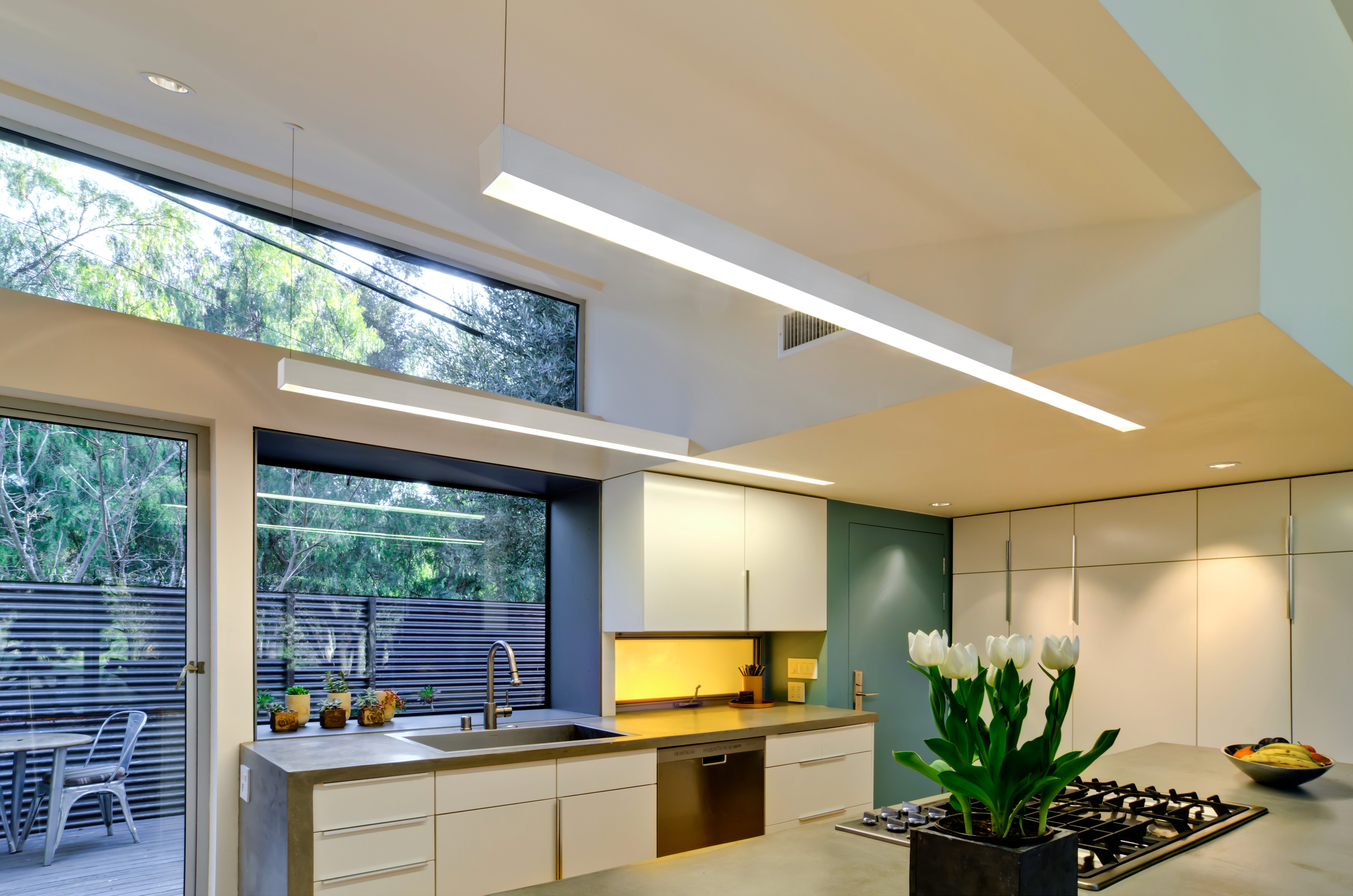 In the kitchen, a set of two 8’ fixtures provides a unique, dynamic addition to the already beautiful space. Using a standard product with a modification, 3’ of the housing is recessed into a drywall ceiling via a fully integrated mud flange, with 5’ of the housing suspended in an open space to create a unique yet breathtaking effect.